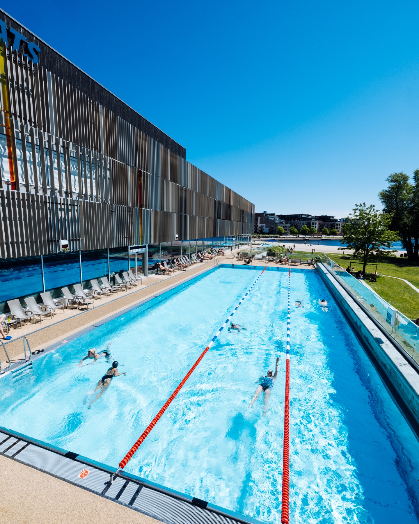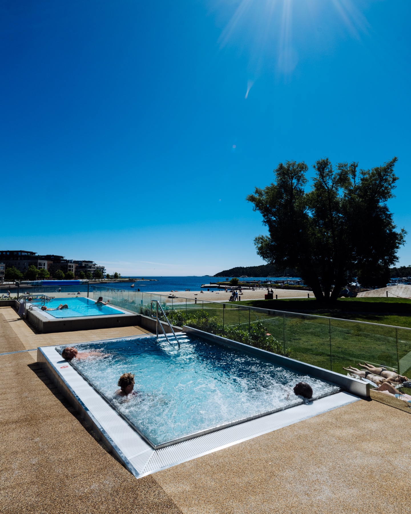 Nyt frisk luft og utsikt mot Bystranda i utebassengene. Her kan du bade året rundt i oppvarmet vann.